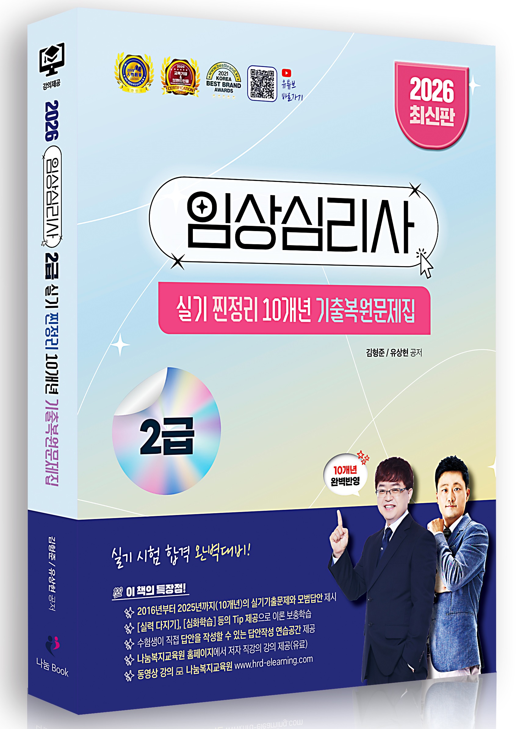 그리고 다년간 [임상심리사 2급 실기기출문제집]을 출간하여 많은 수험생 여러분들이 최종합격할 수 있도록 도와 드렸으며, 2026년에도 수험생 여러분의 최종합격을 힘껏 응원하면서 [2026 임상심리사 2급 실기기출 문제집]을 출간하였습니다.