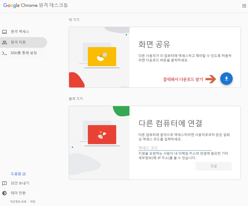 4. '원격 지원'에서 화면 공유 다운로드 아이콘을 클릭합니다.