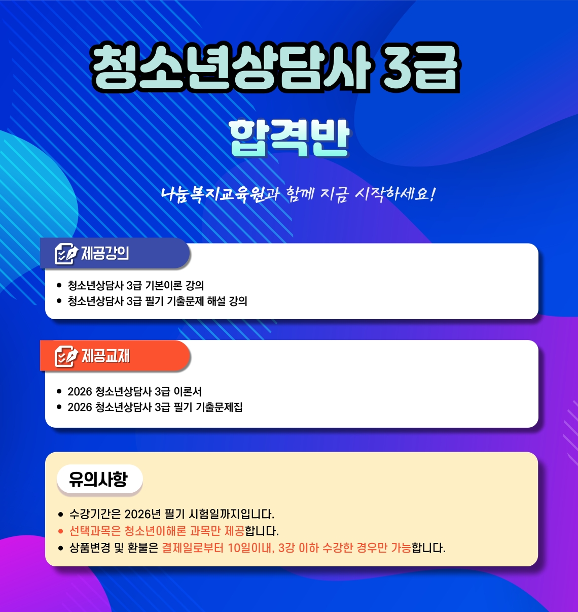 | 12. | [기출문제]청소년상담사3급 청소년이해론 기출문제[2025~2021] - 청소년상담사3급 청소년이해론 기출문제[2025~2021] |