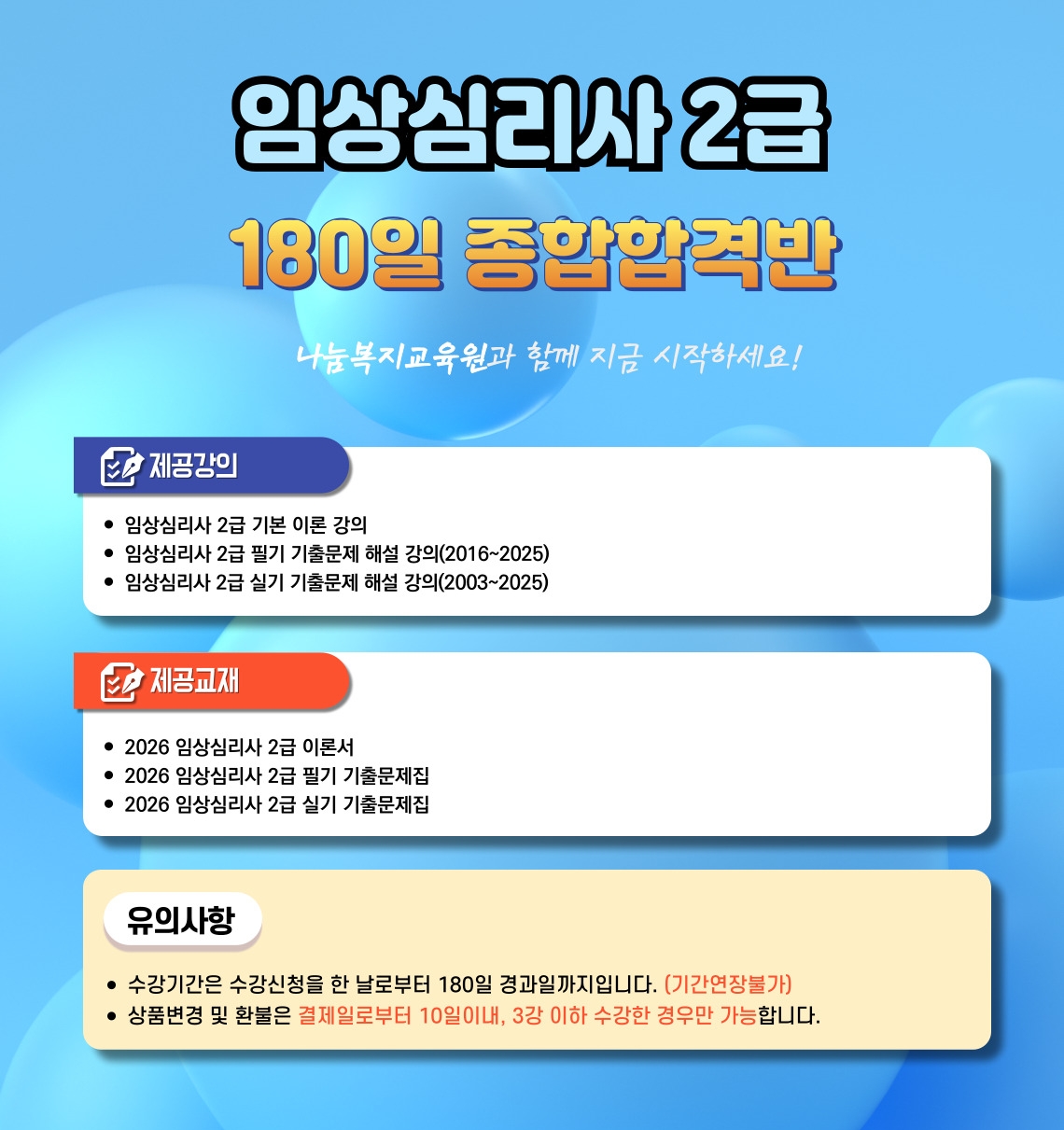 | 6. | [필기문제]심리학개론(2025~2021) 1. 임상심리사2급 시험대비 심리학개론 필기 기출문제 강의입니다. 2. 상품변경 및 환불은 결재일로 부터 10일 이내만 가능하며, 무료강의 포함 3강이하 수강한 경우에만 가능합니다. |